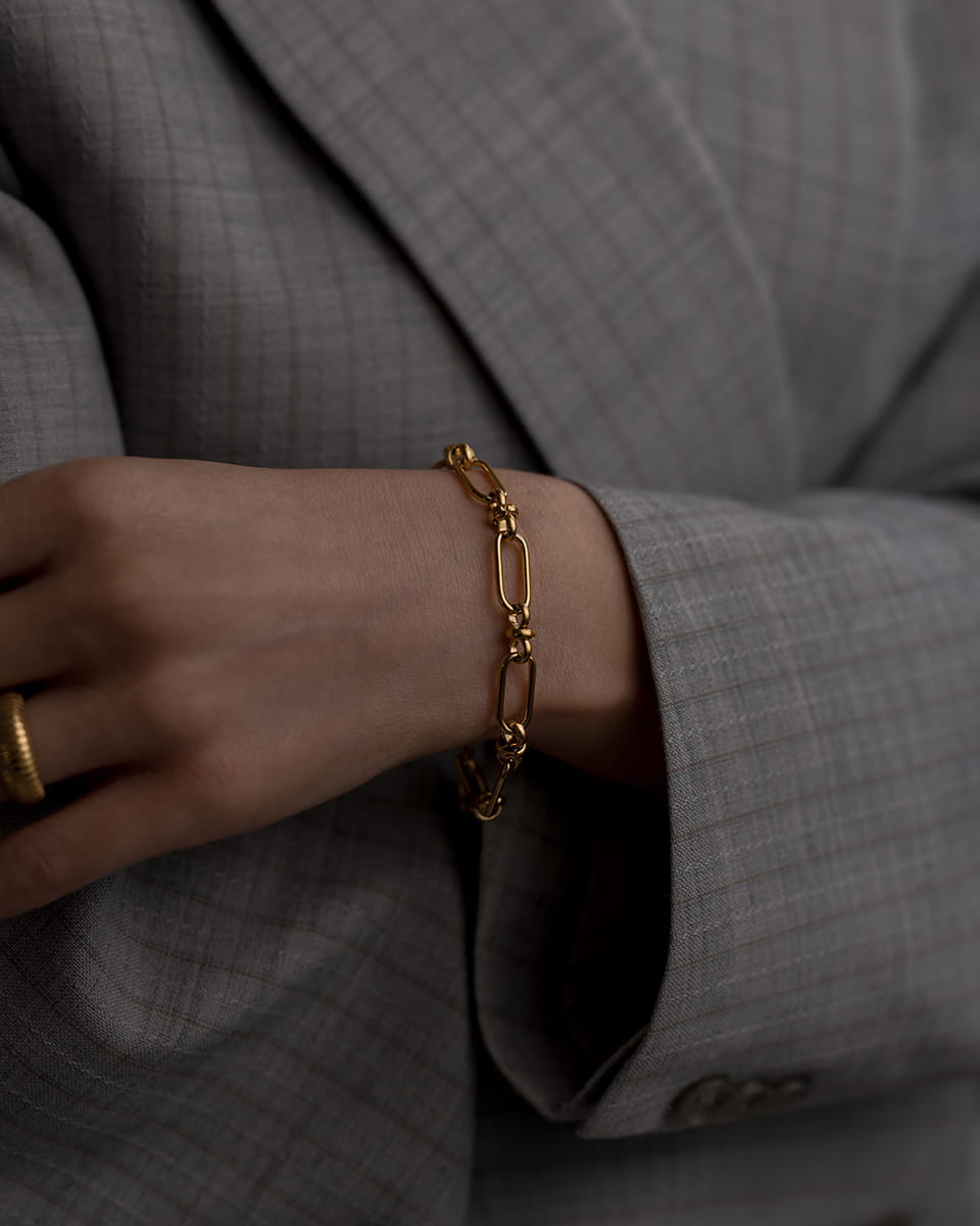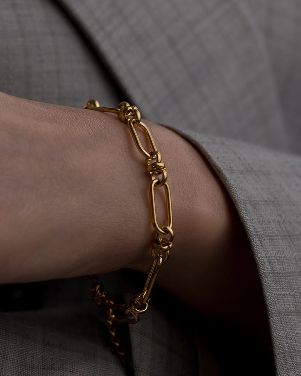 Bransoletka została wykonana z wysokiej jakości stali chirurgicznej, która jest odporna na zarysowania, korozję, a do tego jest hipoalergiczna i wodoodporna. Dodatkowo jest pozłacana 18k złotem, które nadaje jej blasku i prestiżu.