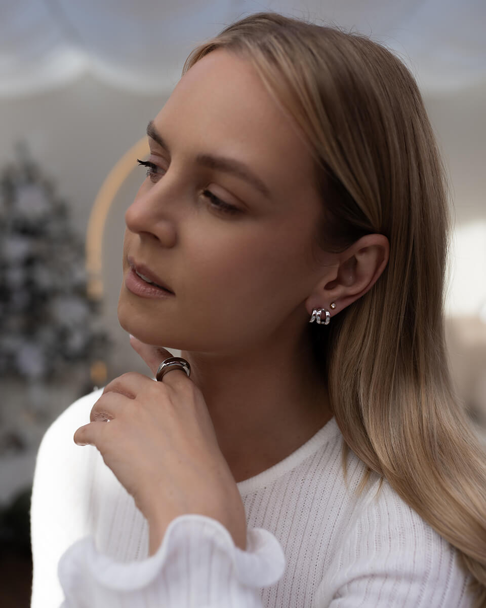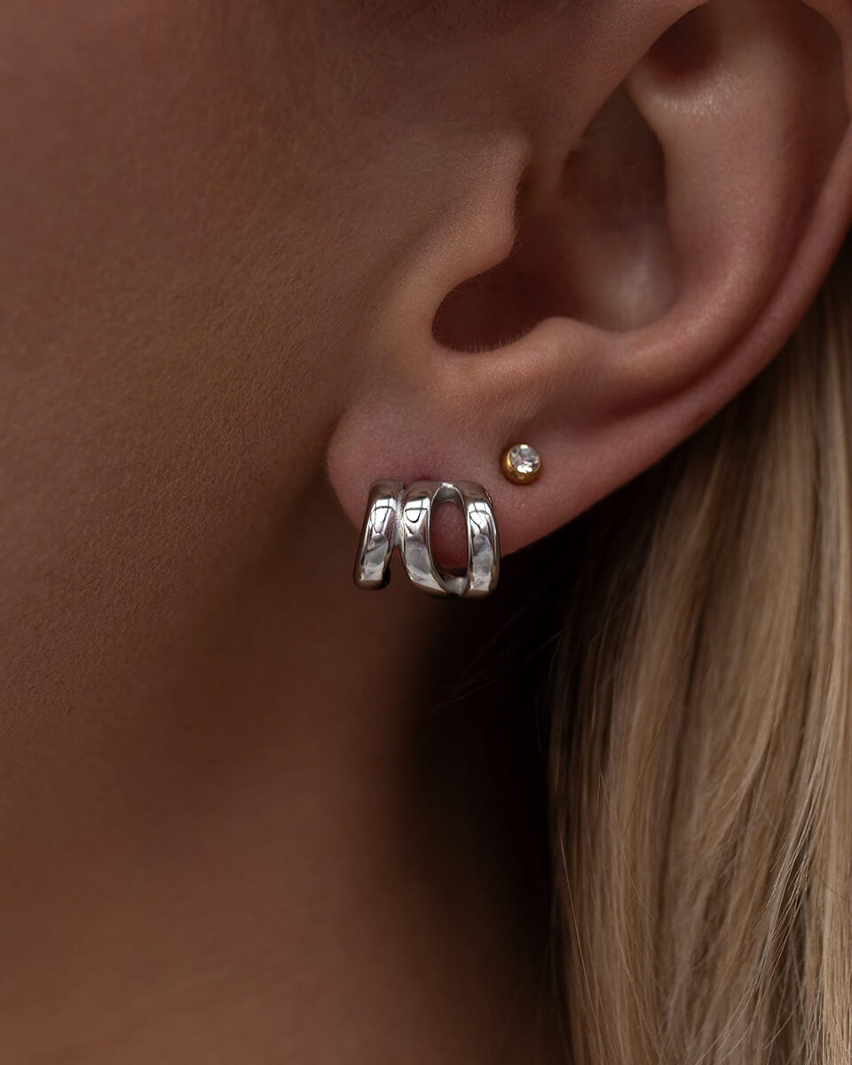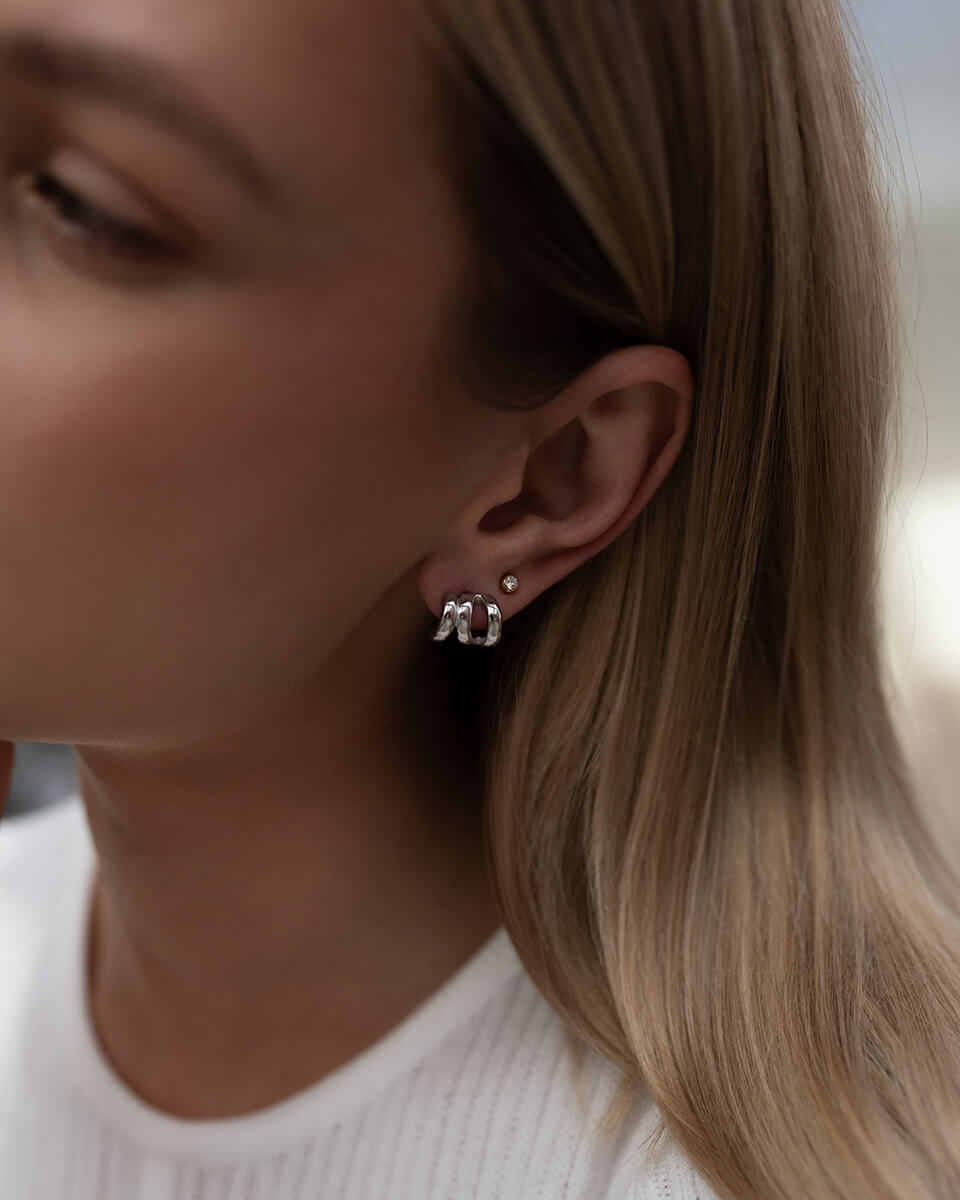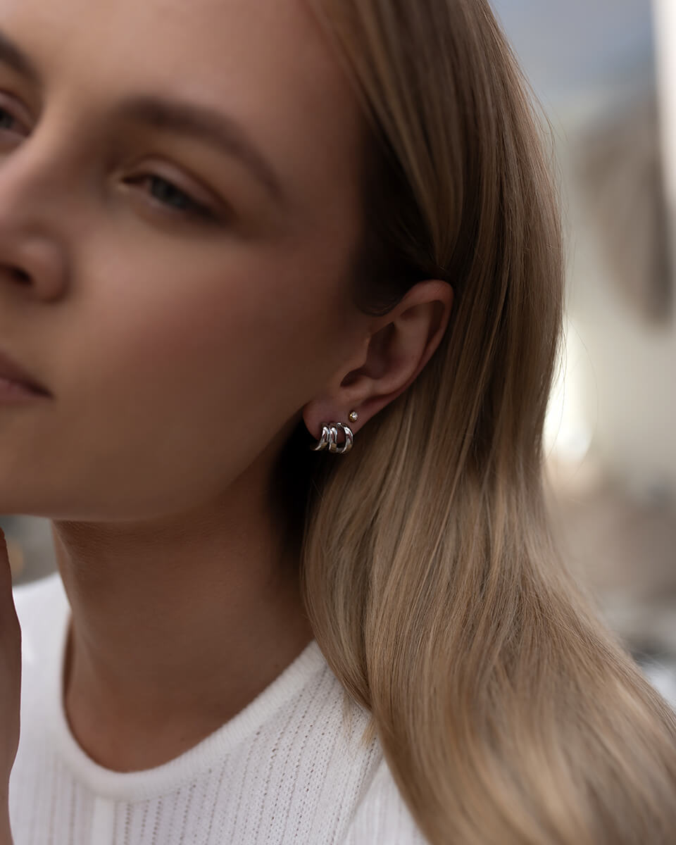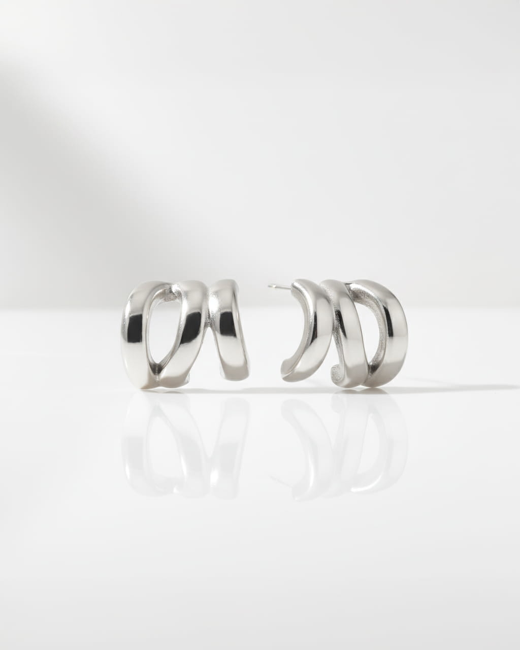 Srebrne kolczyki o artystycznej, rzeźbiarskiej formie z trzema subtelnie wygiętymi liniami, które tworzą efekt potrójnych kolczyków bez dodatkowych przekłuć - lekkie, stylowe i pełne charakteru, idealne na co dzień i na wyjątkowe okazje.