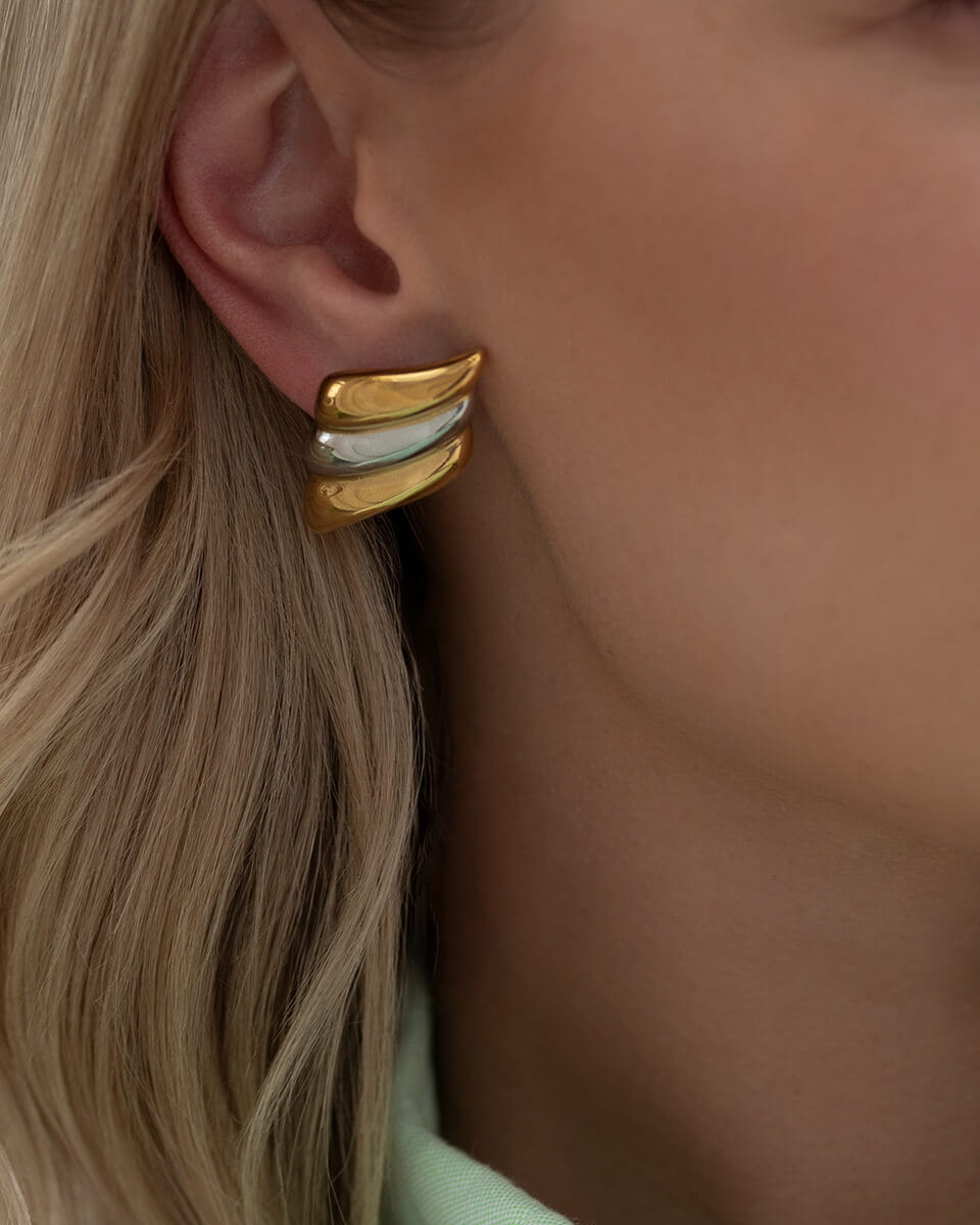 Srebrno-złote kolczyki ze stali chirurgicznej.