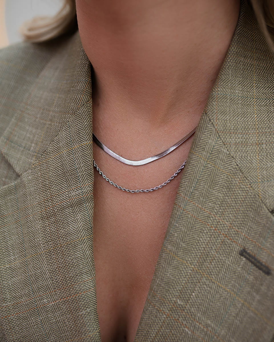 Dwie warstwy, jeden gotowy efekt. Ten srebrny naszyjnik łączy gładki splot żmijki z delikatnym, cienkim łańcuszkiem typu kordel. Dzięki temu wygląda jak perfekcyjnie ułożony zestaw.