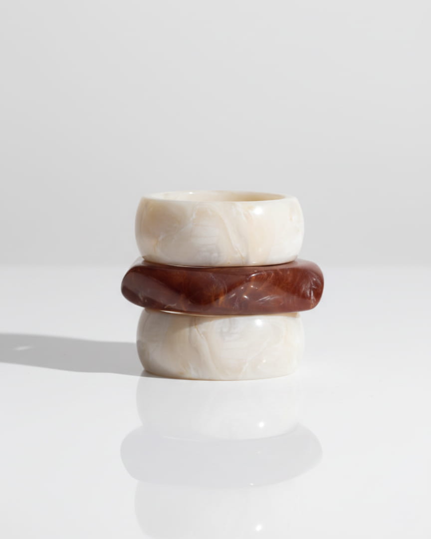 Bransoletka Vanillae to wyrazisty, szeroki model wykonany z marmurkowej żywicy w odcieniu kremowo-waniliowym. Jej organiczny, lekko nieregularny wzór sprawia, że każda sztuka jest unikatowa. To biżuteria, która wygląda jak designerski akcent z wakacyjnego kurortu.