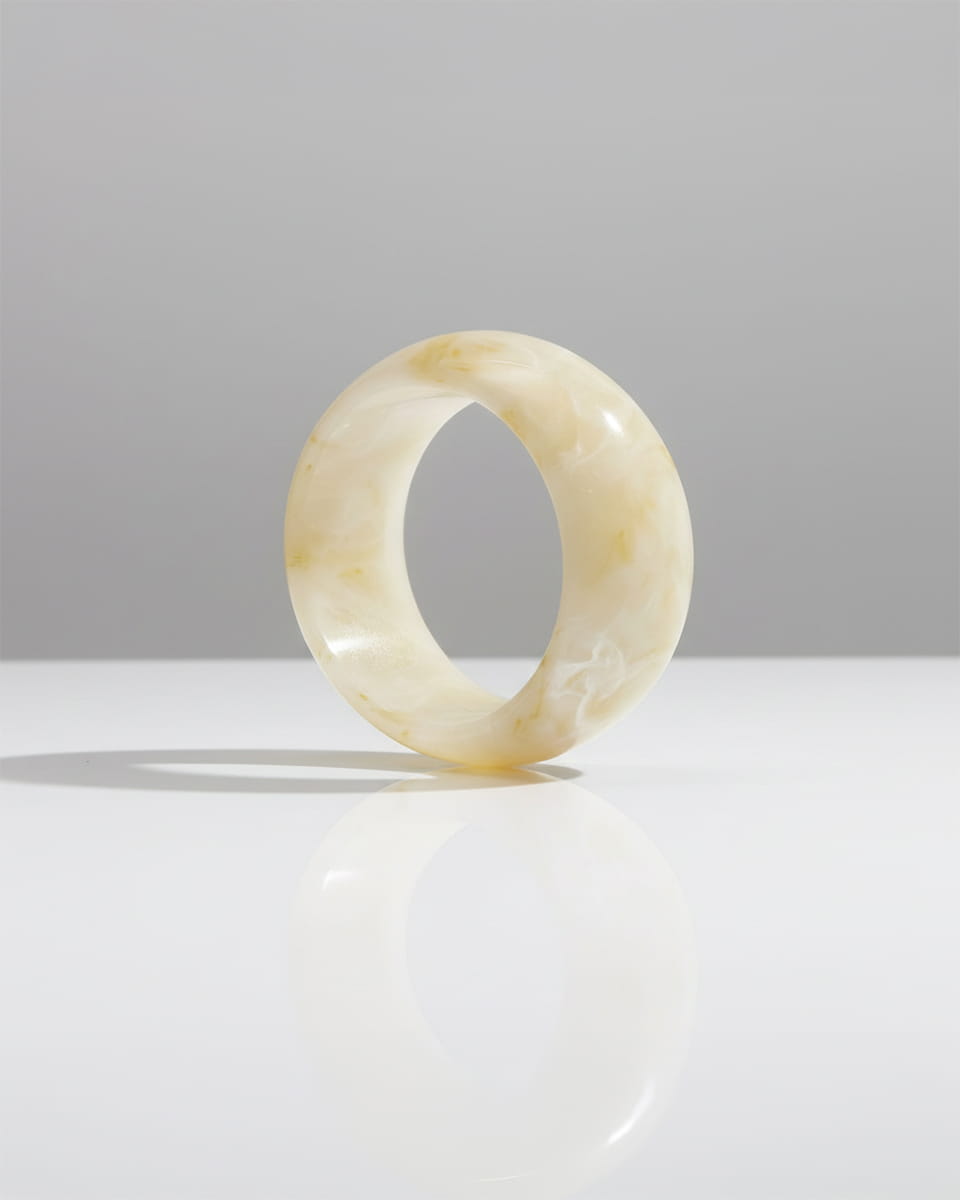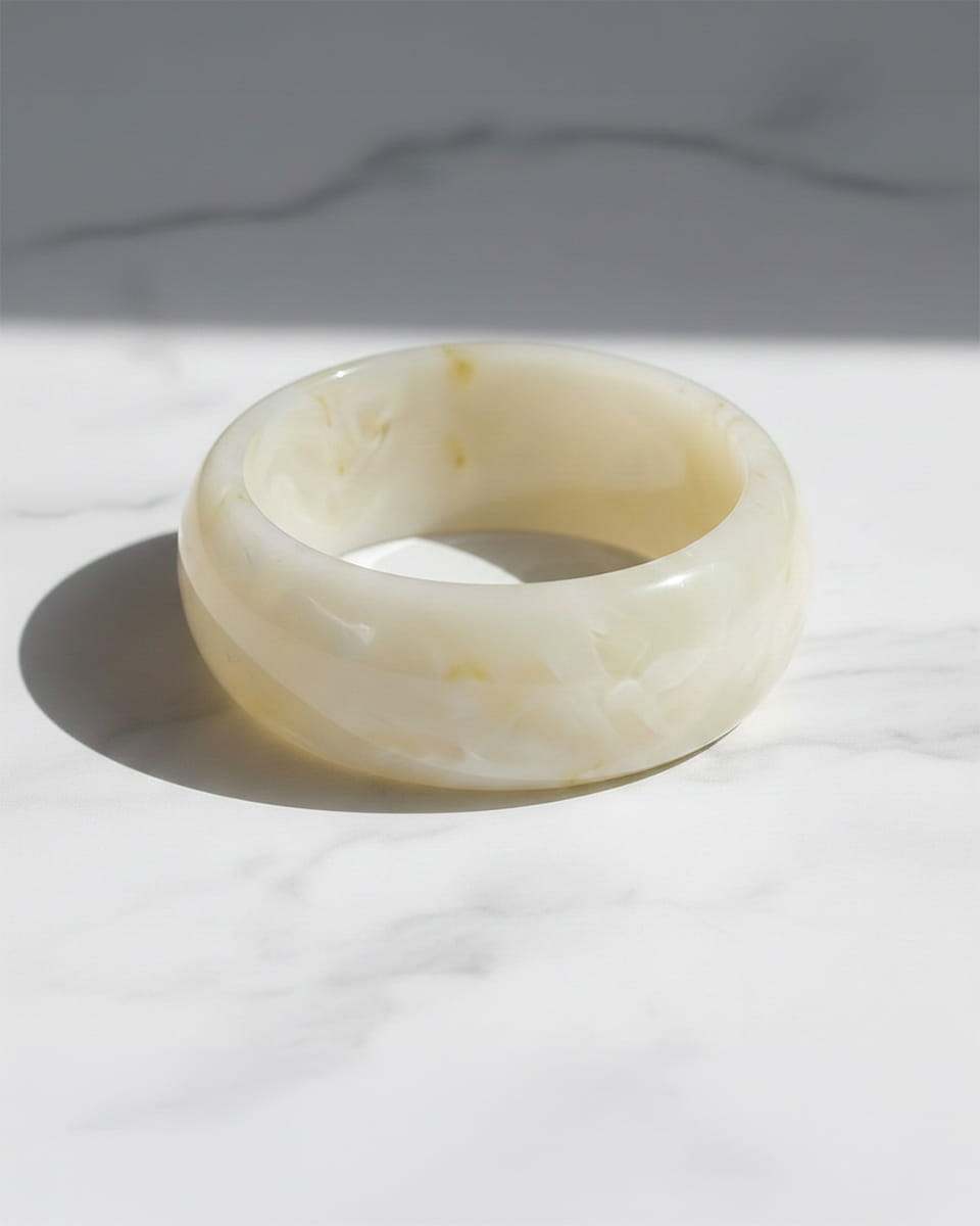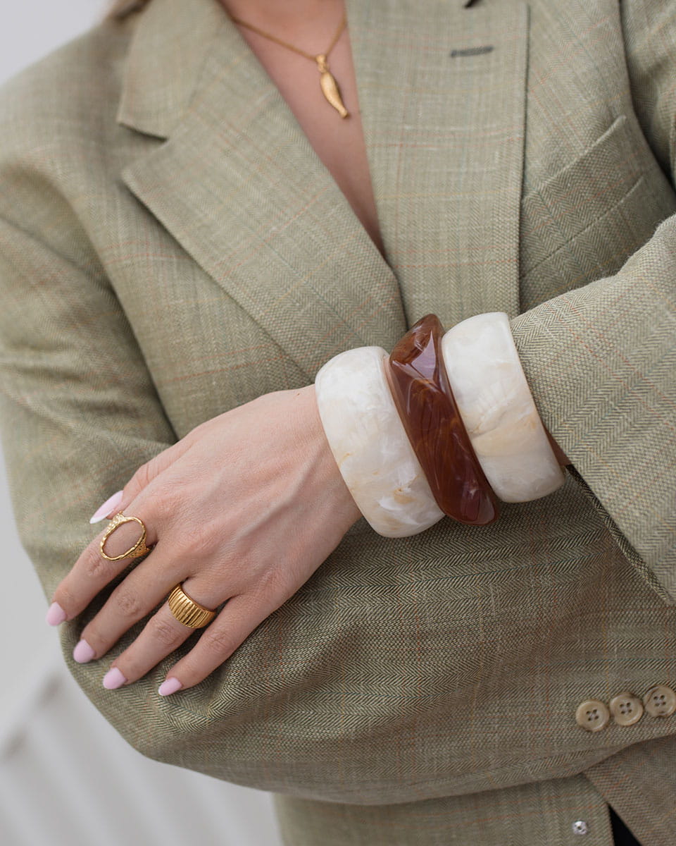Masywna bransoletka z żywicy w kremowo, marmurkowym odcieniu, która przyciąga spojrzenia i nadaje stylizacji wyrazistego, modowego charakteru.