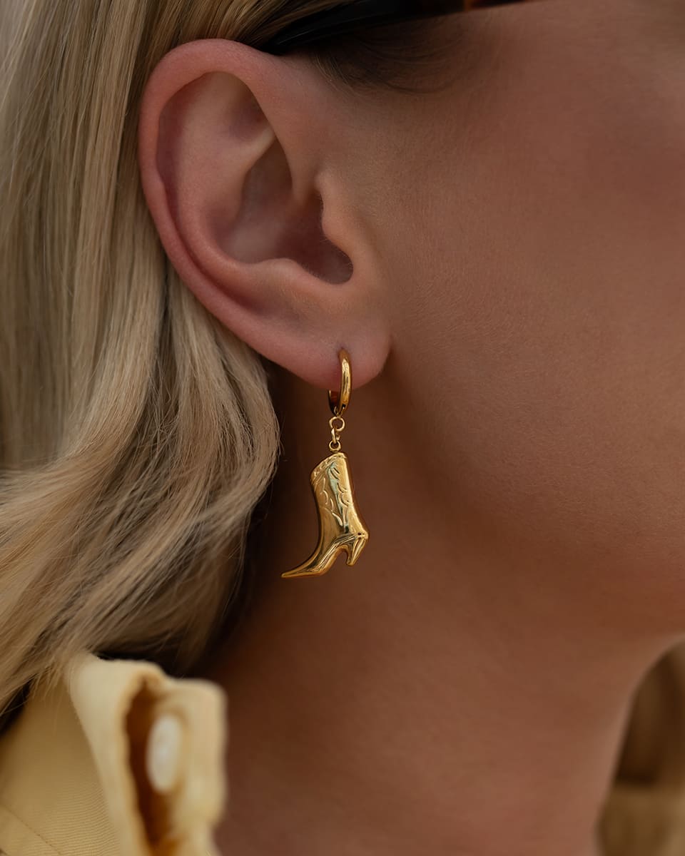 Niesymetryczne kolczyki – złoty kapelusz i kowbojski but – to zabawny, stylowy akcent z charakterem. Lekkie, oryginalne i idealne do prostych stylizacji, którym chcesz dodać modowego twistu.