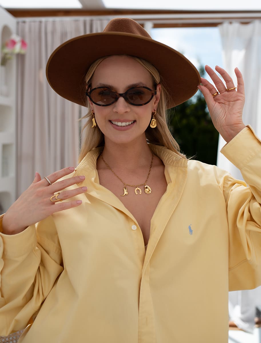 Złoty naszyjnik z zawieszkami w kształcie kowbojskiego buta, kapelusza i podkowy to biżuteria z pazurem, która dodaje luzu każdej stylizacji. Towarzyszą mu asymetryczne kolczyki – jeden z butem, drugi z kapeluszem – lekkie, oryginalne i przyciągające spojrzenia.