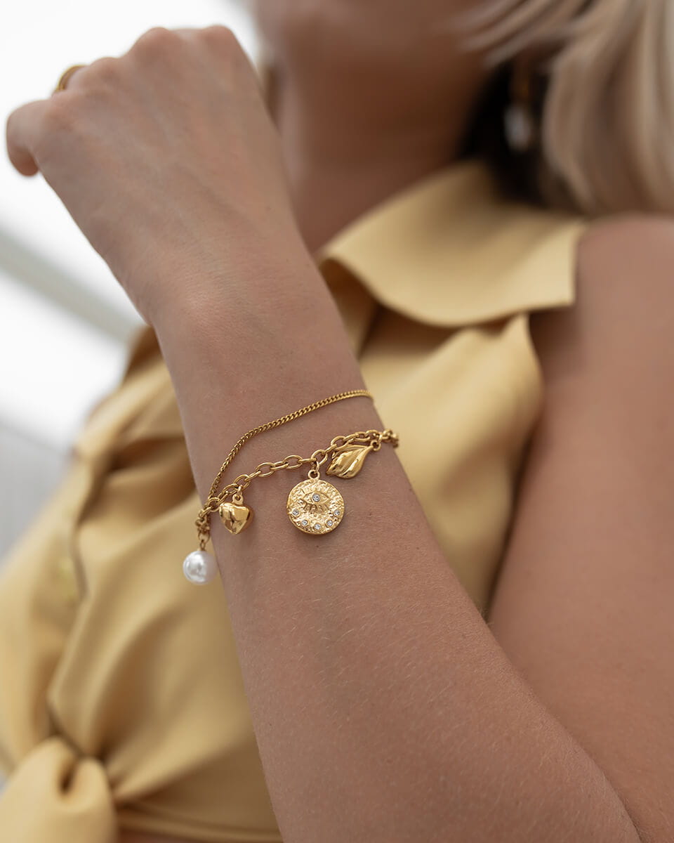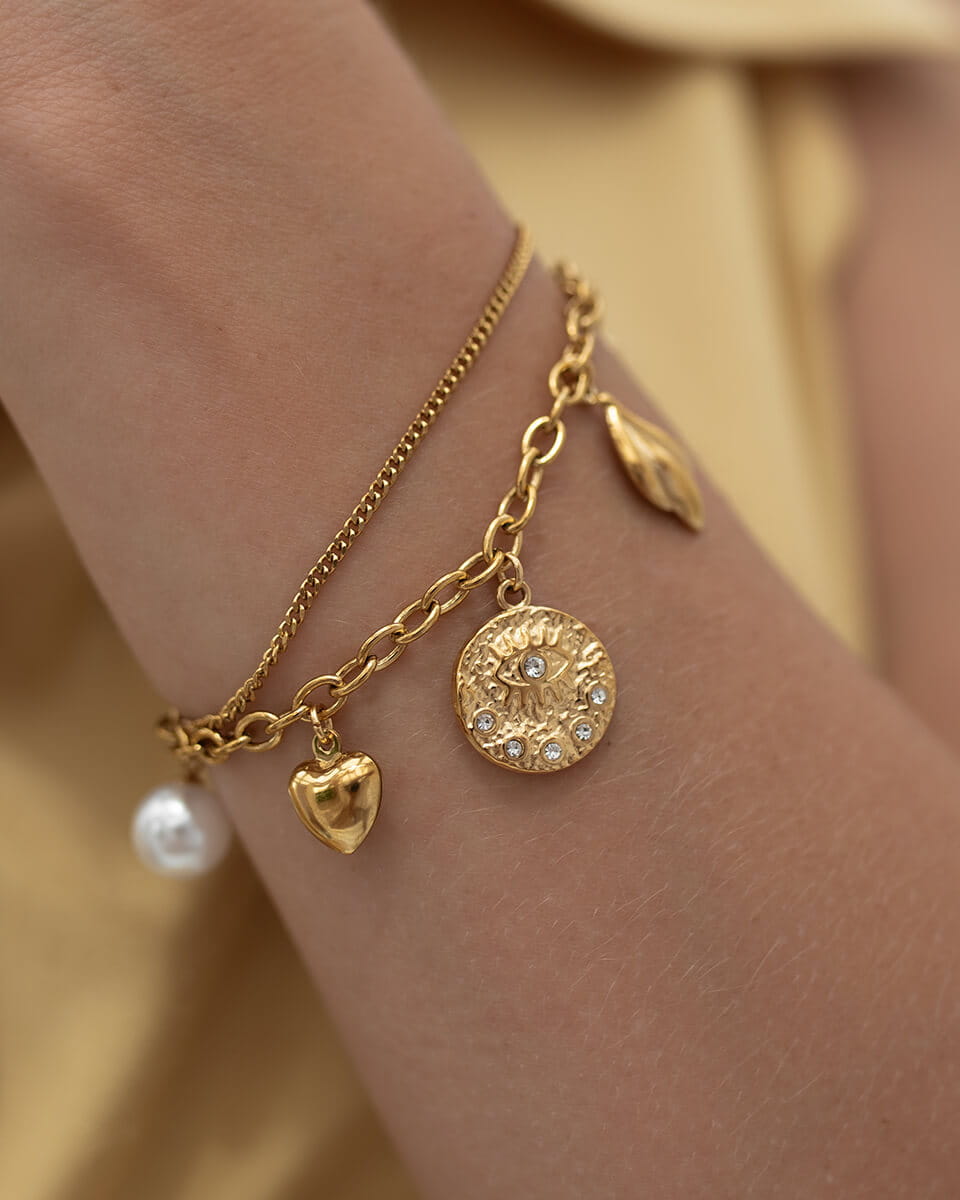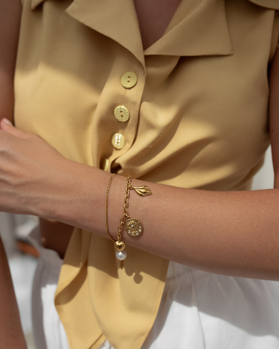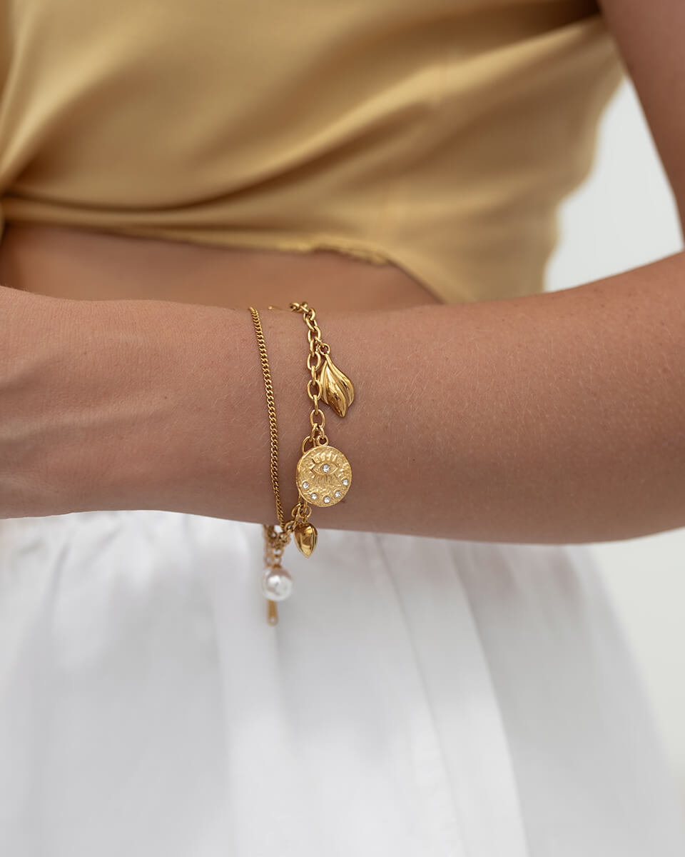Szukasz dodatku, który mówi: "jestem kobieca, stylowa i pełna uroku"? Ta złota bransoletka z zawieszkami to esencja delikatności i wyrafinowanego smaku. Połączenie perły, serduszka, liścia i błyszczącej rozety symbolizuje kobiecość, miłość i siłę natury.