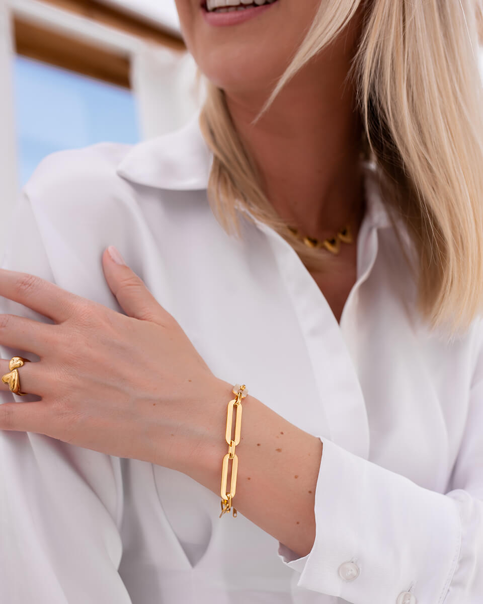 Jej duże ogniwa tworzą harmonijną kompozycję, emanując delikatnym blaskiem złota, który przyciąga spojrzenia i dodaje niepowtarzalnego uroku każdej stylizacji.
