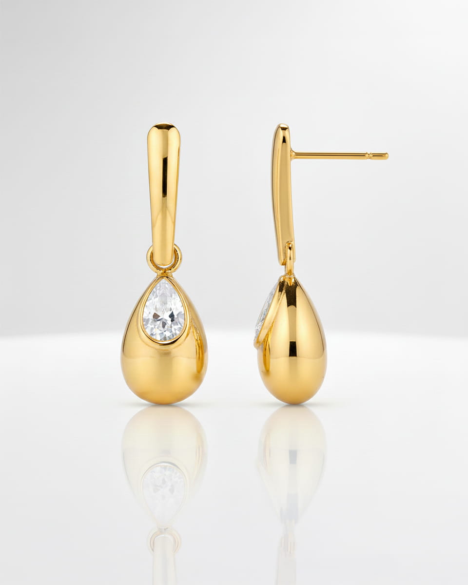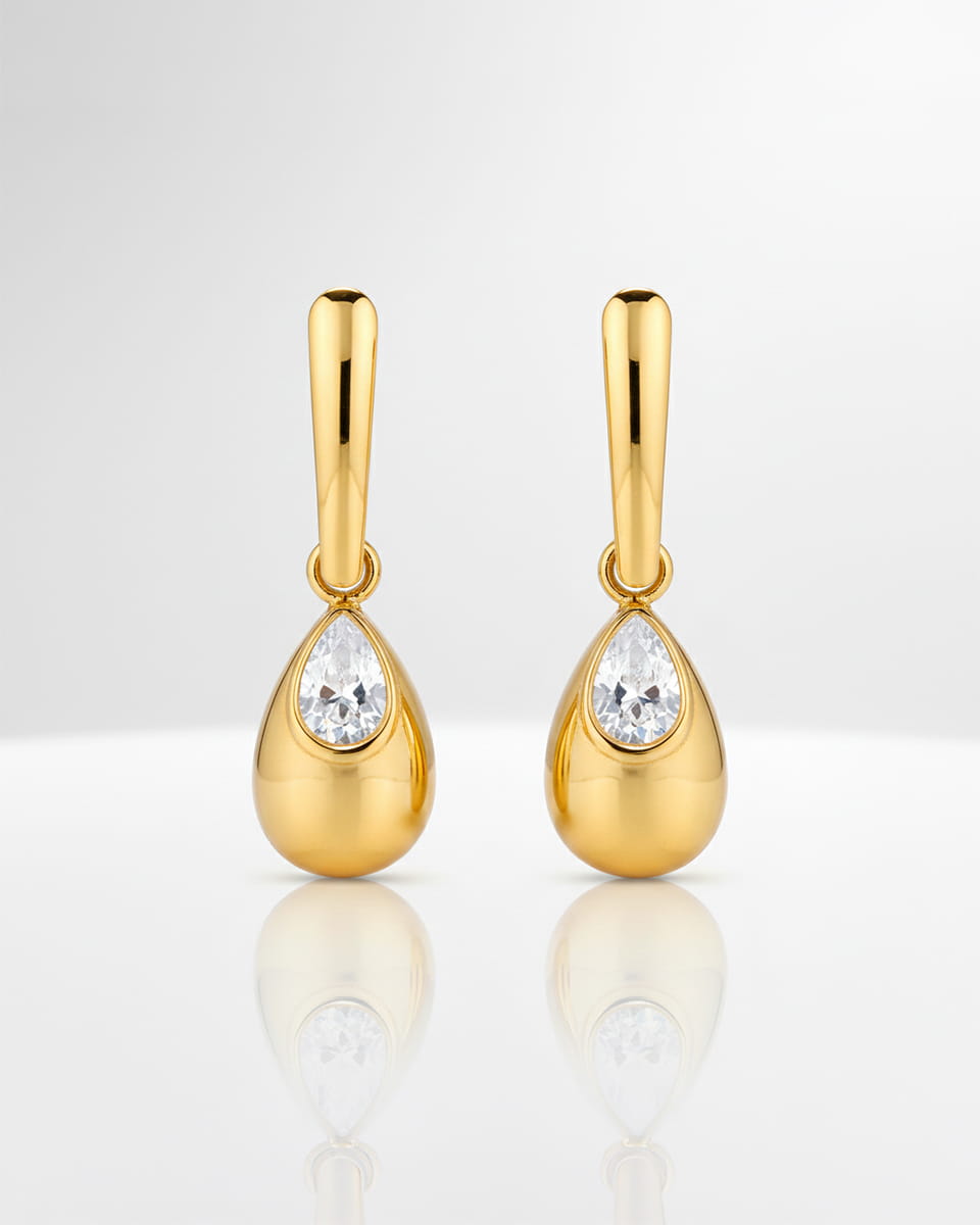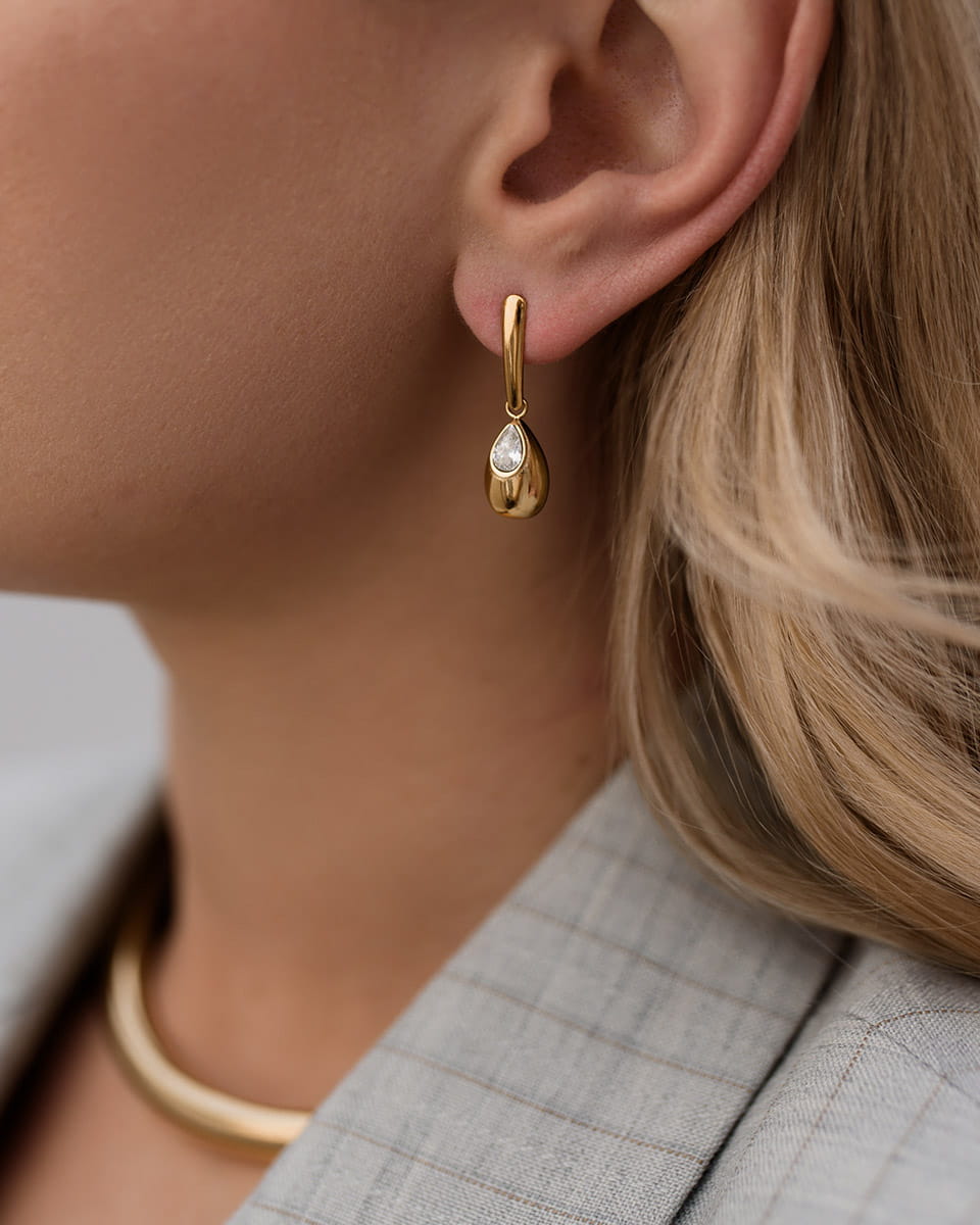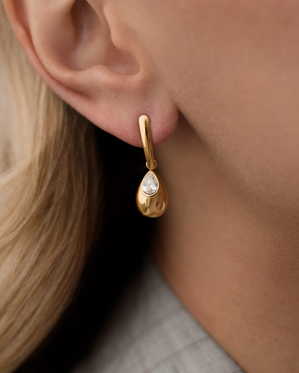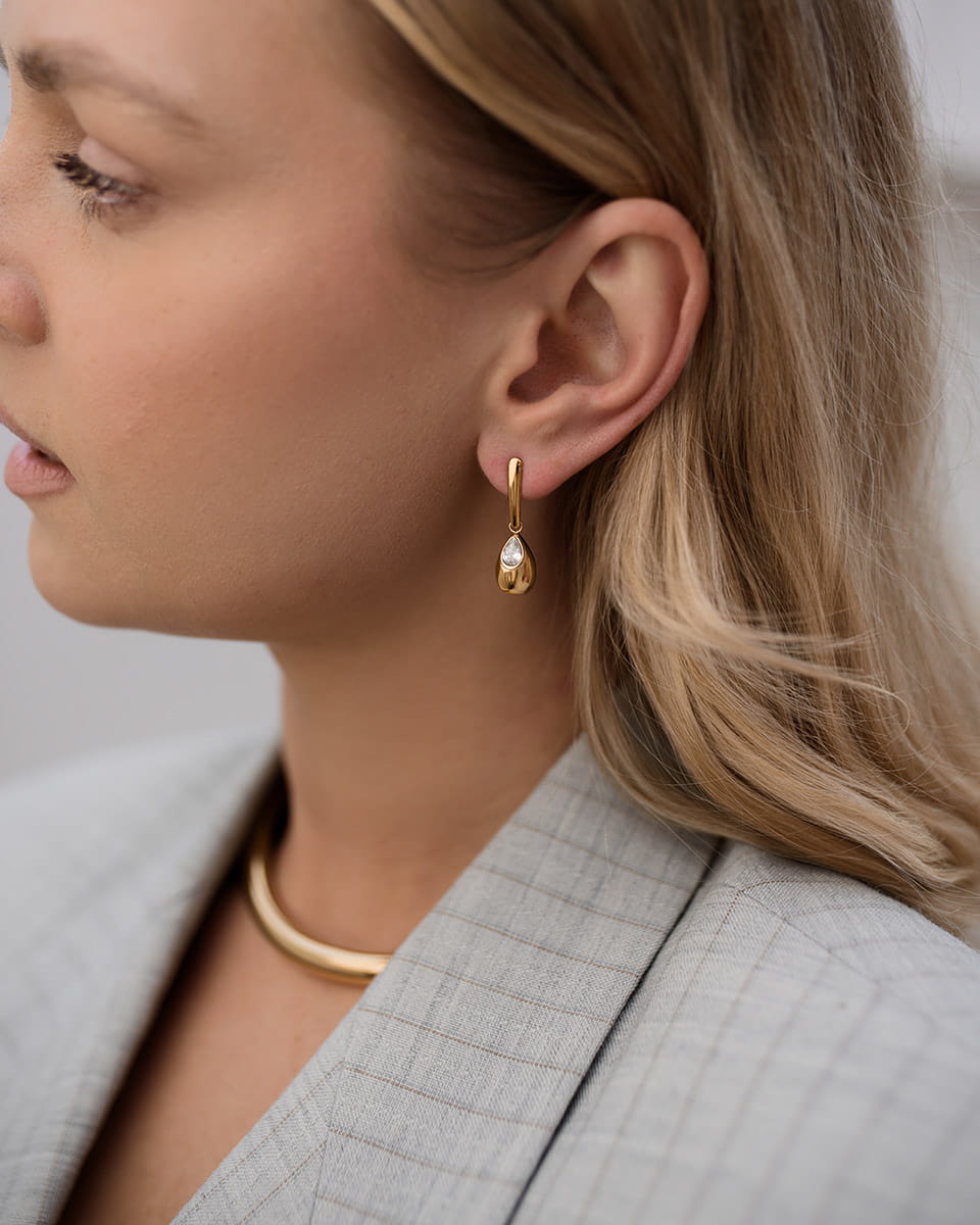 Model Elavira to złote wiszące kolczyki na sztyfcie ze stali chirurgicznej, które łączą smukłą, minimalistyczną formę z subtelną cyrkonią osadzoną w opływowej kropli. To biżuteria, która wysmukla twarz i pięknie porusza się przy każdym ruchu.