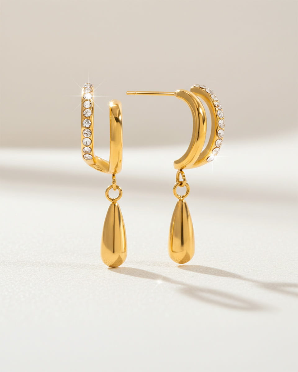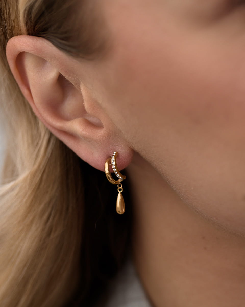 Model Lunessa to złote wiszące kolczyki ze stali chirurgicznej premium, które łączą nowoczesną formę półokręgu wysadzanego cyrkoniami z subtelną, opływową kroplą. To połączenie klasy i minimalizmu, które przyciąga spojrzenia.