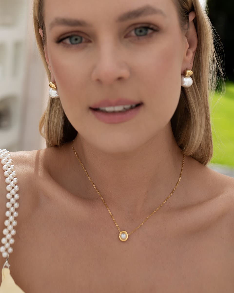 Kolczyki Vorena to elegancja w najczystszej postaci. Gładka, złota góra i duża, błyszcząca perła u dołu tworzą niezwykle efektowny duet. Choć są wyraziste, nie obciążają stylizacji – pasują zarówno do białej koszuli, jak i do sukienki.
