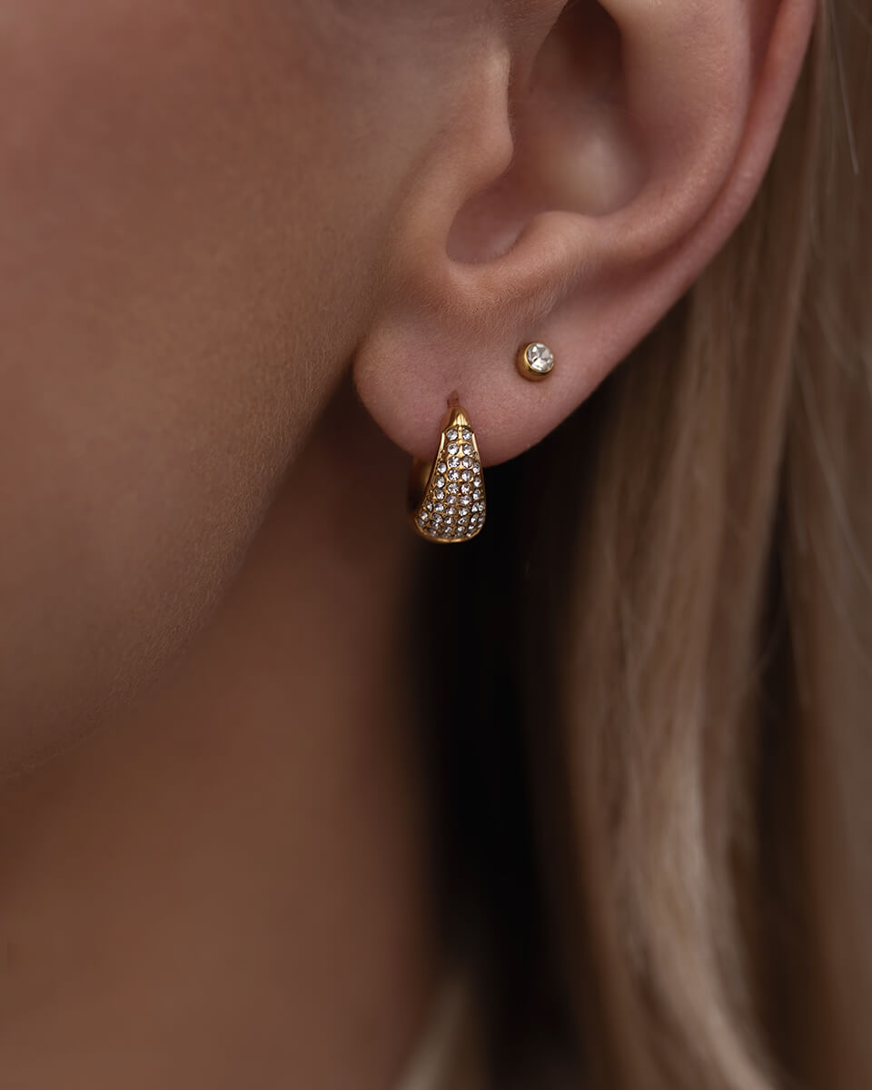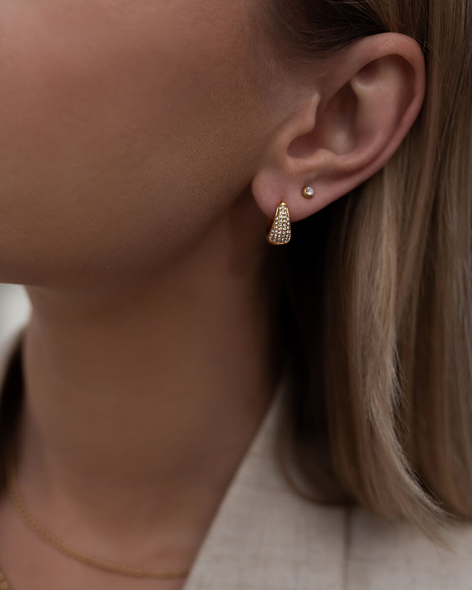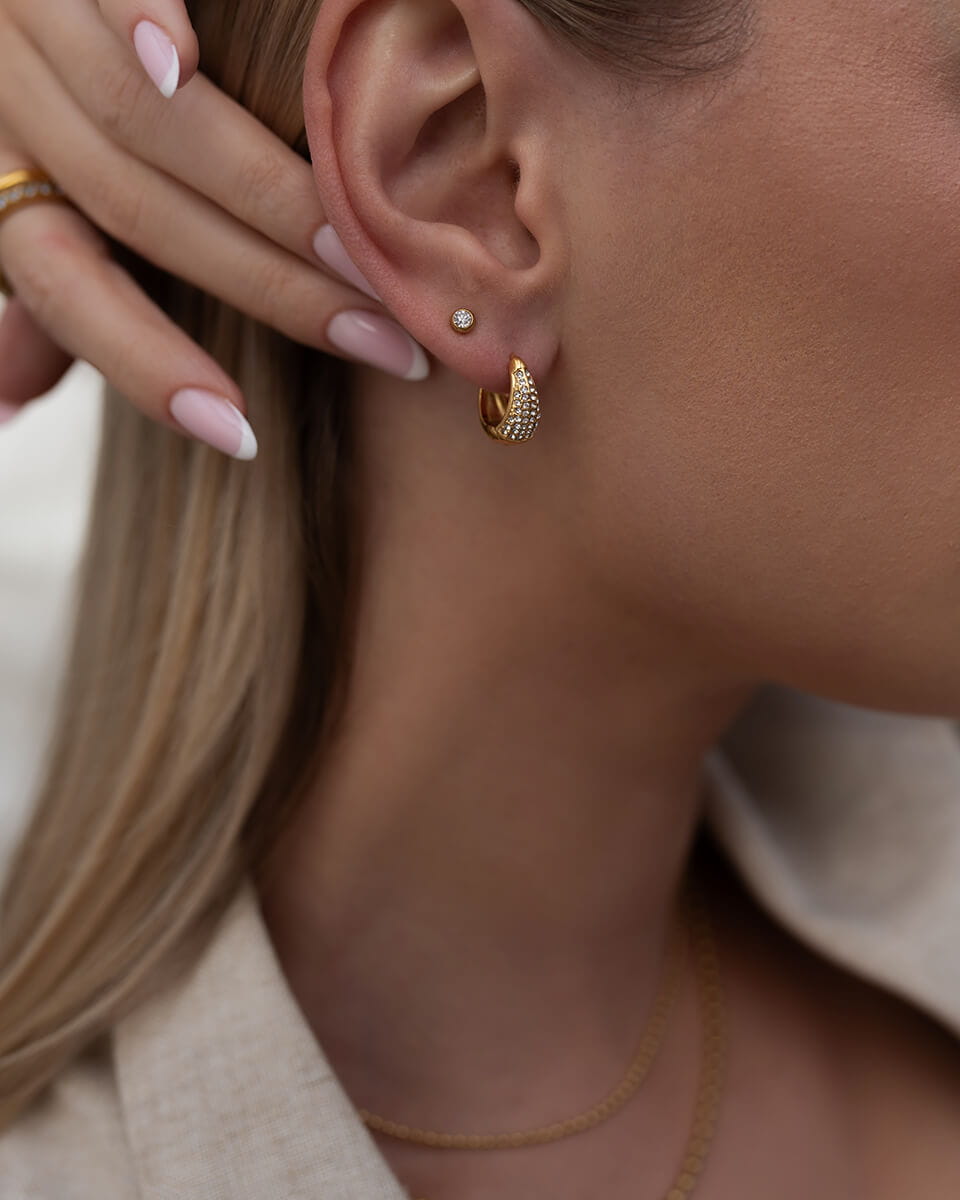 Złote kolczyki koła z błyszczącymi cyrkoniami, które subtelnie odbijają światło i dodają twarzy elegancji - klasyczny kształt w nowoczesnym wydaniu.