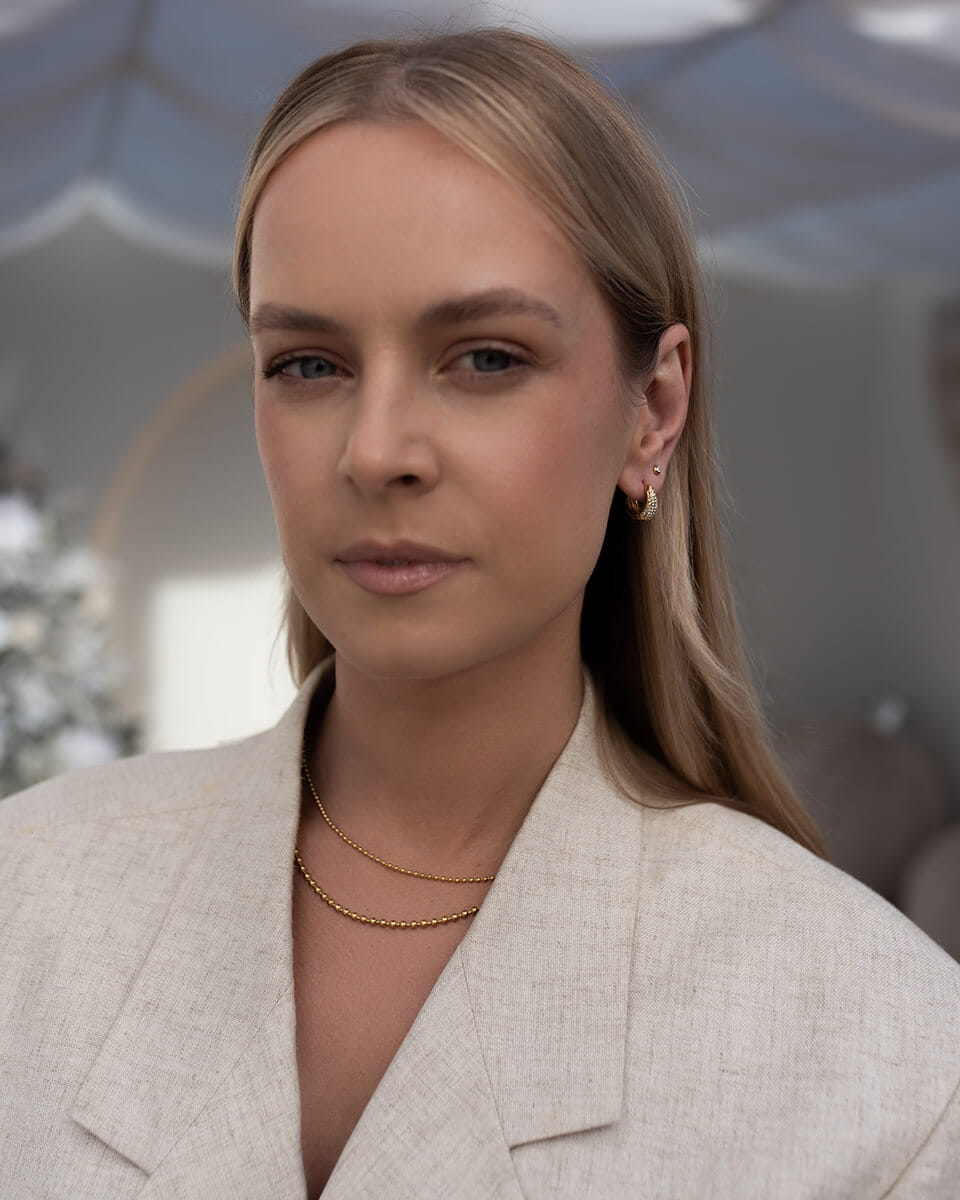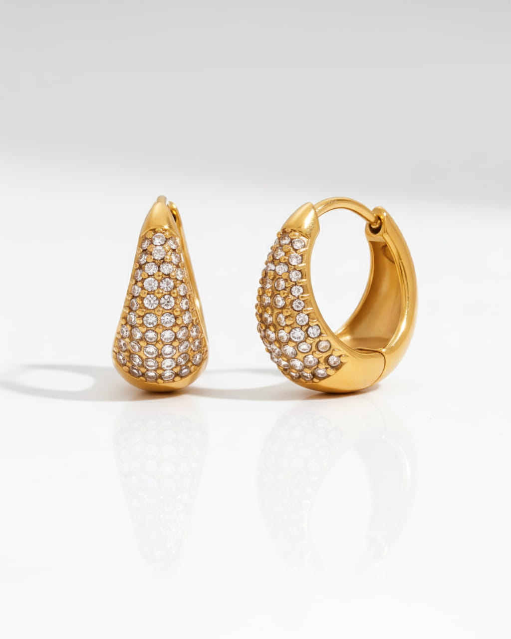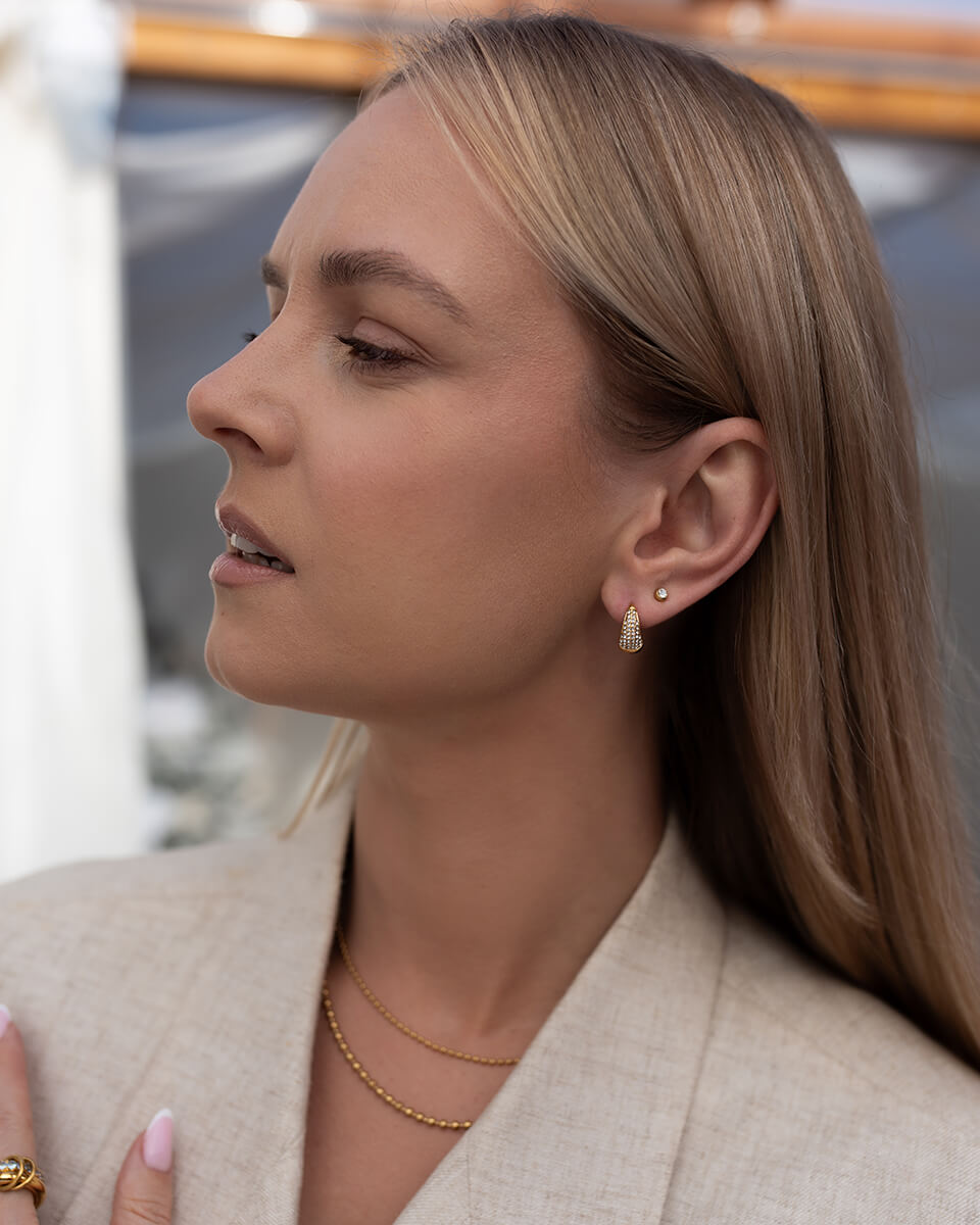 Złote kolczyki koła z błyszczącymi cyrkoniami, które subtelnie odbijają światło i dodają twarzy elegancji - klasyczny kształt w nowoczesnym wydaniu.
