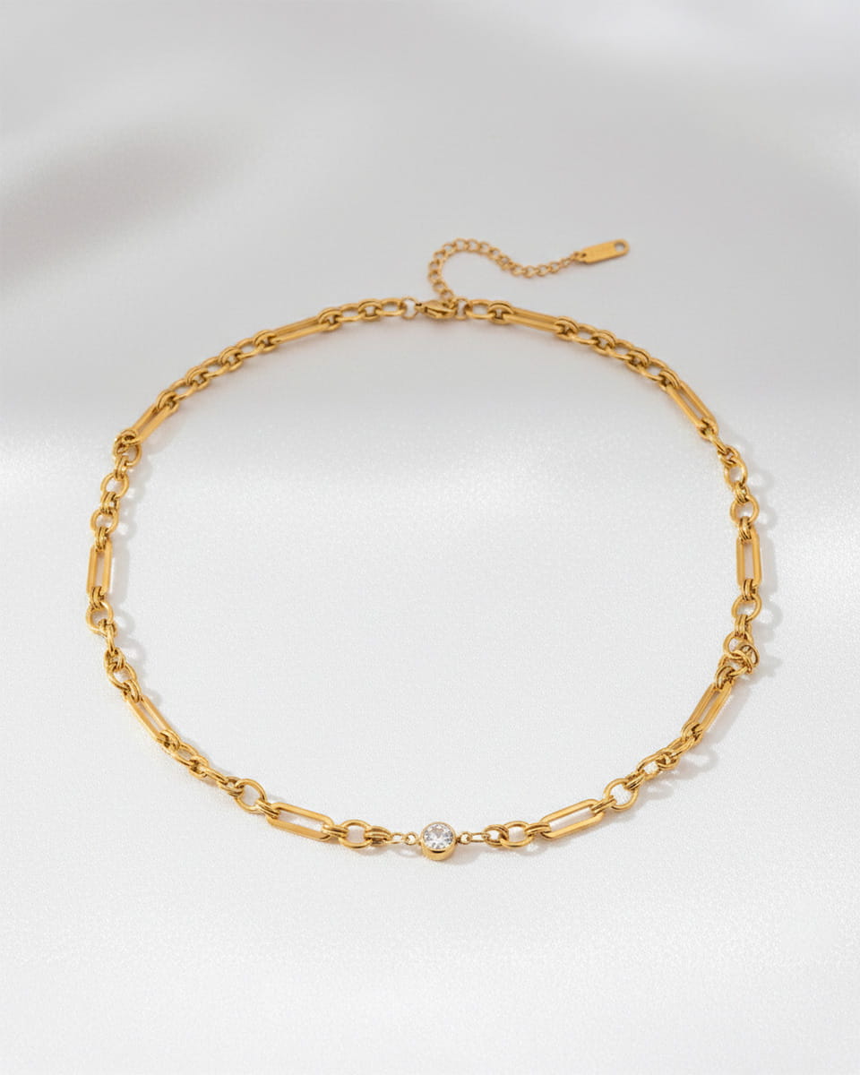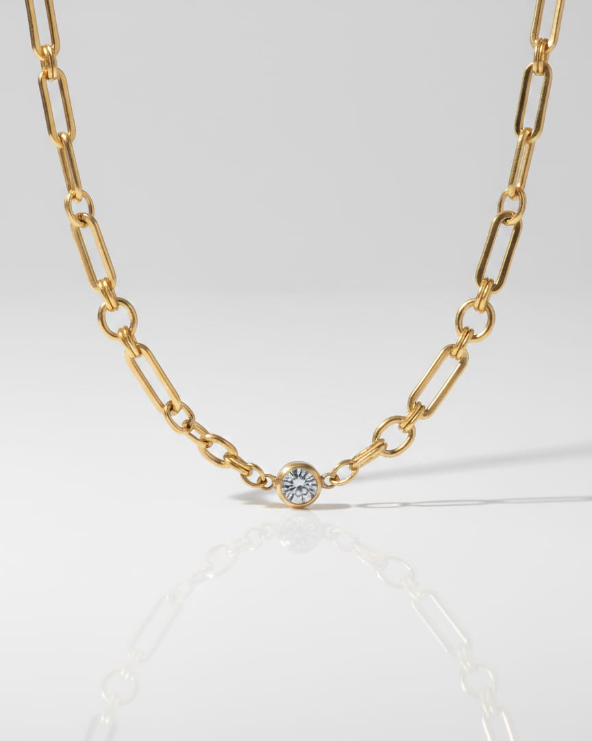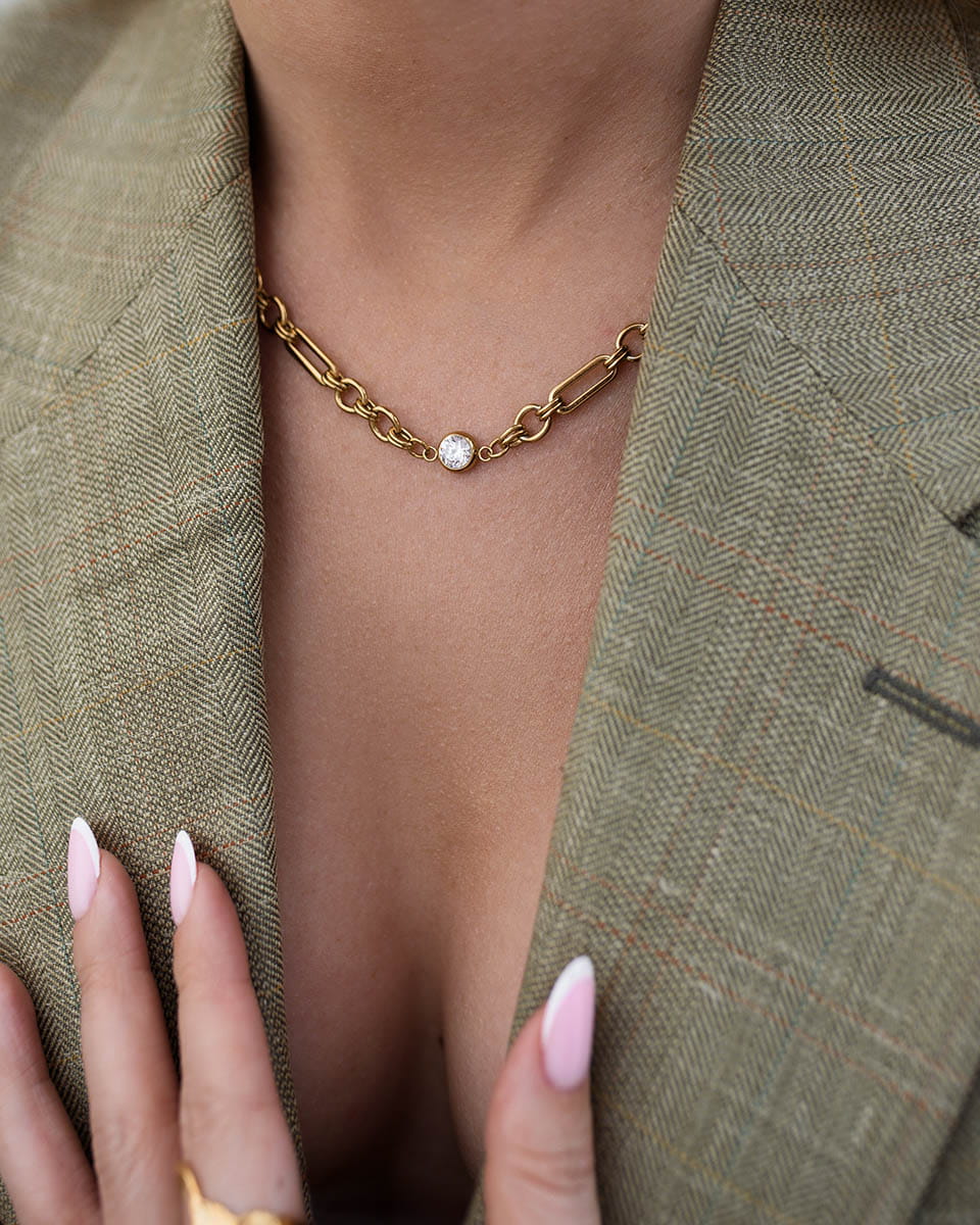 Model Solenne to złoty naszyjnik łańcuszek ze stali chirurgicznej, który łączy nowoczesne, geometryczne ogniwa z subtelną cyrkonią w centralnym punkcie. To połączenie minimalizmu i charakteru - delikatny błysk kamienia przyciąga spojrzenia, a wyrazisty łańcuch dodaje stylizacji pewności siebie.
