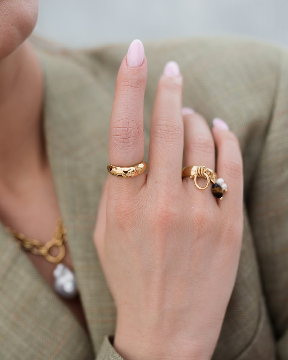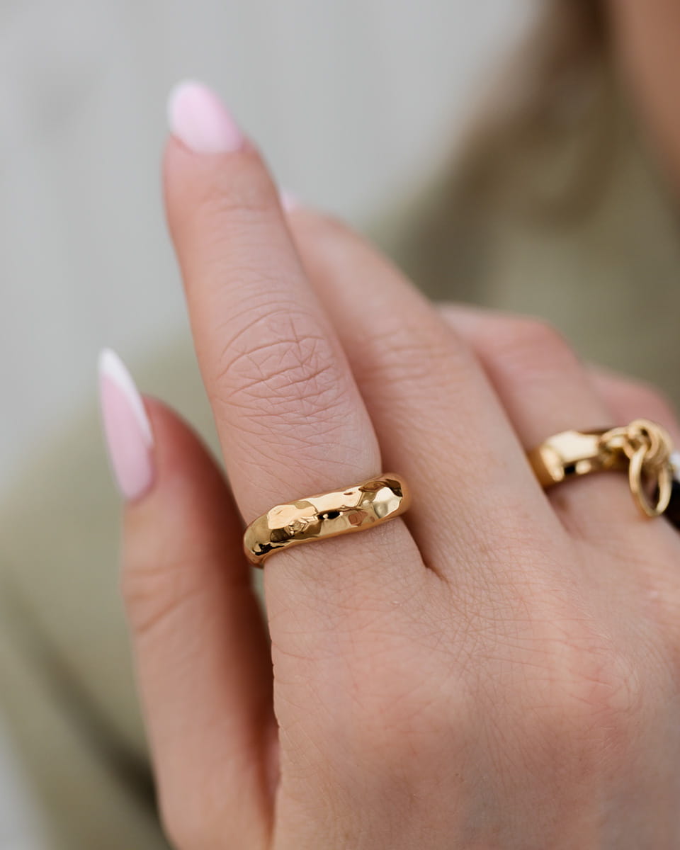 Aurea to pierścionek dla kobiet, które kochają prostotę z charakterem. Delikatnie młotkowana powierzchnia sprawia, że światło odbija się od niego w nieoczywisty sposób - dzięki temu wygląda luksusowo, choć pozostaje minimalistyczny.