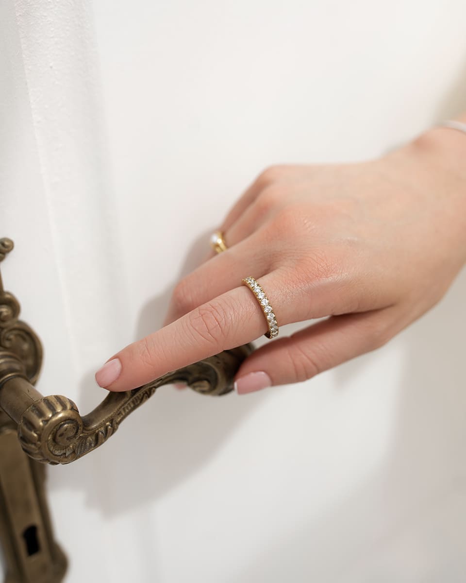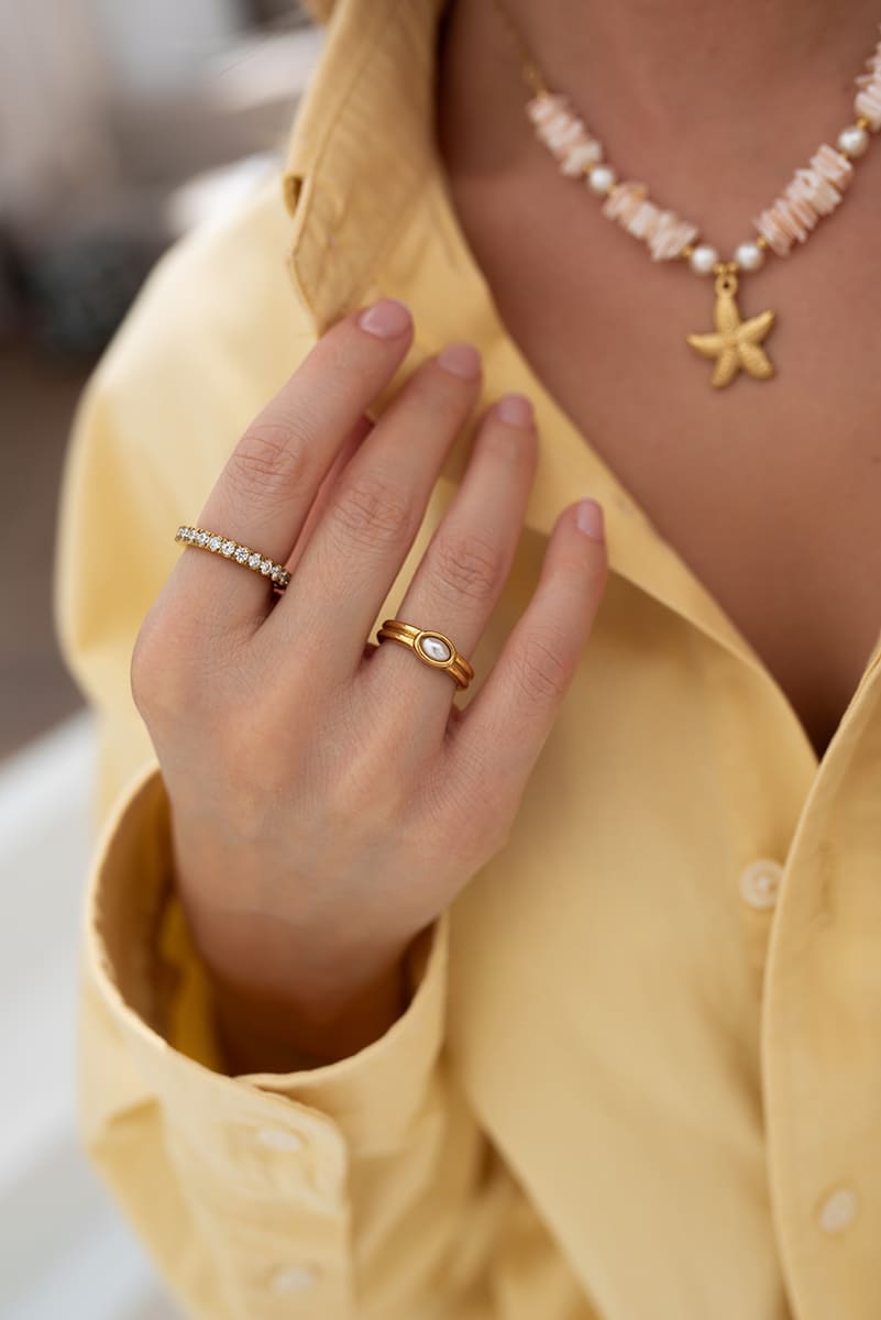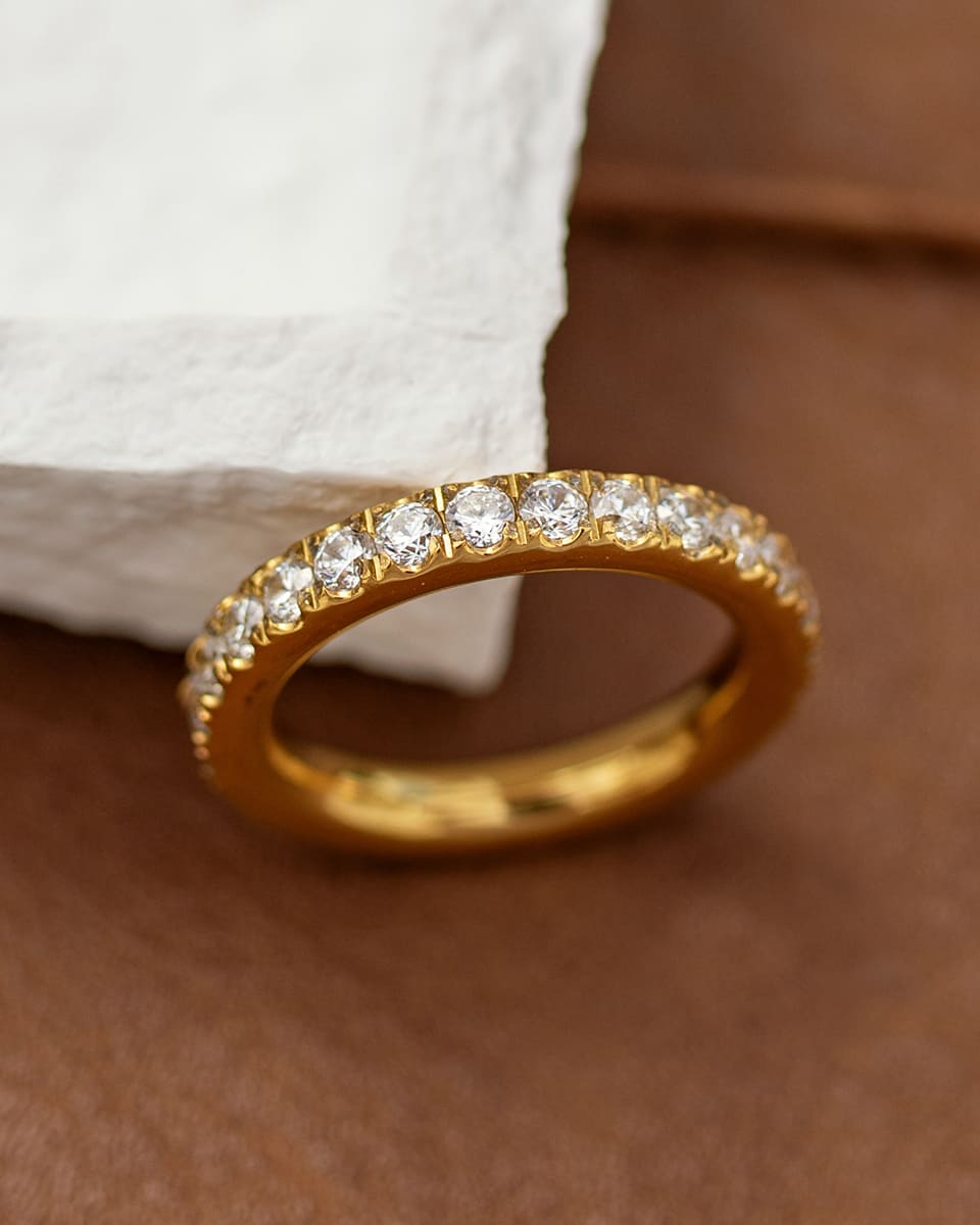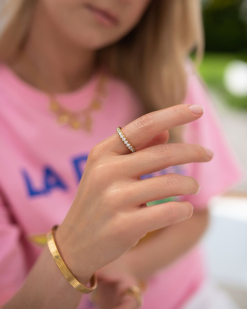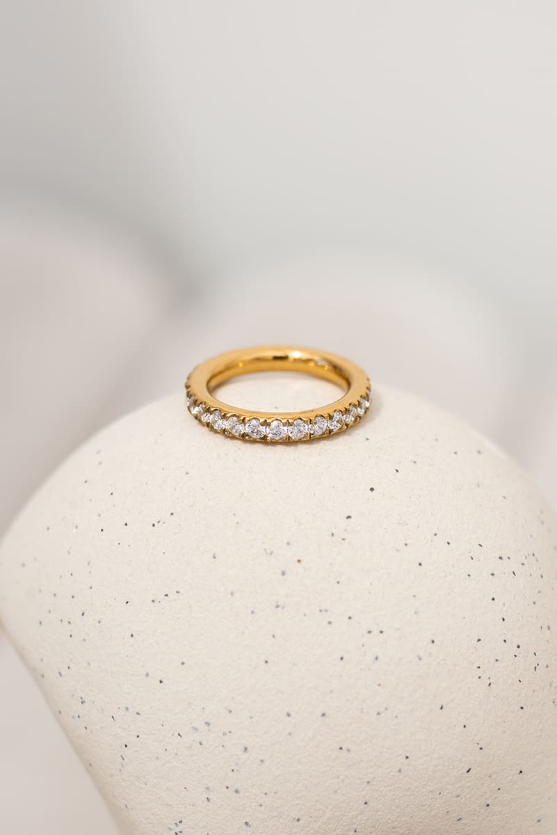 Efektowny pierścionek wysadzany błyszczącymi cyrkoniami, który wygląda jak białe złoto. Trwały, hipoalergiczny i odporny na codzienne warunki – elegancja bez kompromisów.