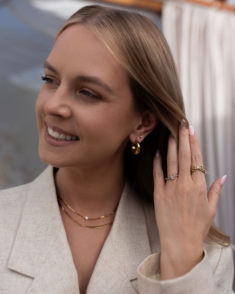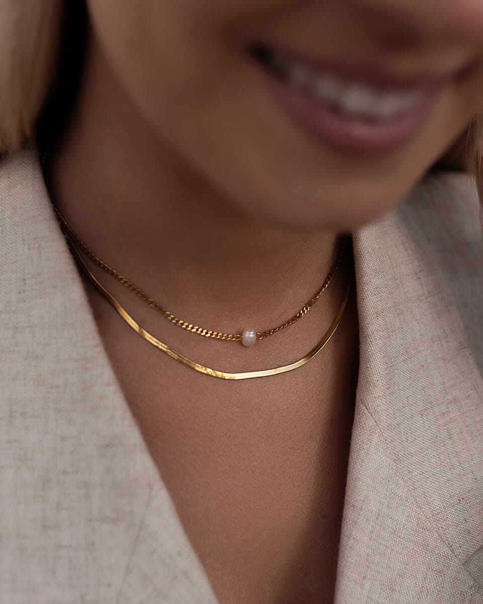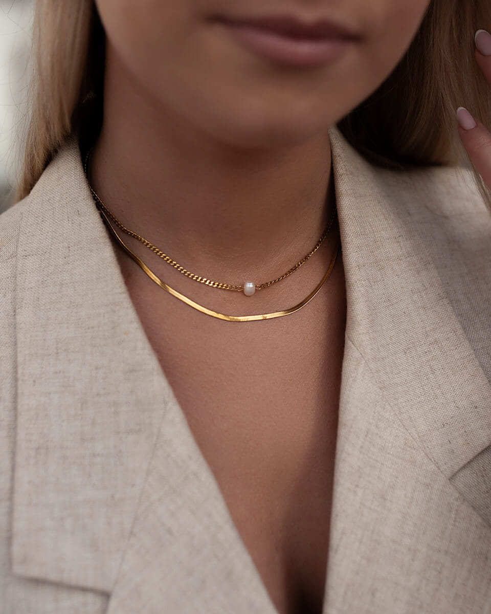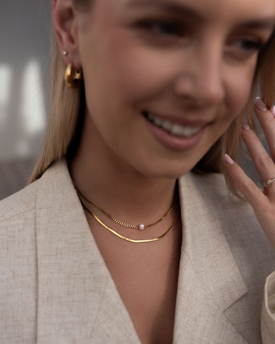 Stylowy, złoty naszyjnik o podwójnym splocie to uniwersalna biżuteria, która idealnie wpisuje się w aktualne trendy. Subtelne połączenie dwóch różnych łańcuszków - klasycznego splotu typu ankier oraz eleganckiej żmijki tworzy efektowną całość, która przyciąga wzrok i dodaje szyku każdej stylizacji. Wykonany ze stali chirurgicznej premium, naszyjnik zachowuje blask nawet przy intensywnym użytkowaniu. Jest wodoodporny, nie ciemnieje, nie ściera się i nie traci koloru, dzięki czemu zyskujesz trwałą i estetyczną biżuterię na lata. Idealny dla kobiet, które zastanawiają się jaka biżuteria nie uczula i jednocześnie świetnie wygląda w każdej stylizacji - od codziennej po wieczorową.
